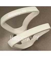 Пара белых каплевидных пластиковых подлокотников для офисного кресла.